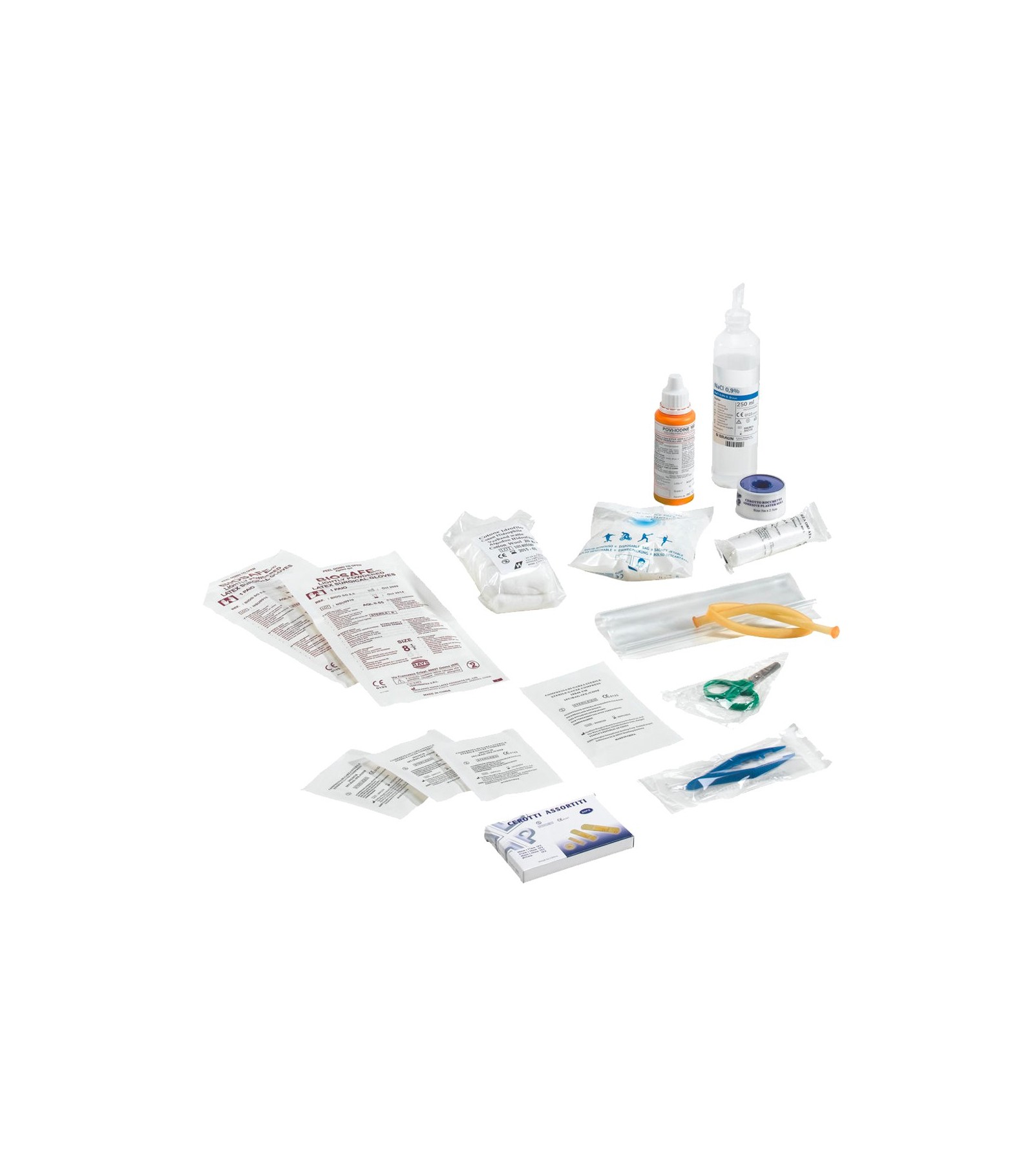 2 paia di guanti sterili monouso, 1 flacone di soluzione cutanea di idopovidene di 10% di iodio da 125 ml, 1 compressa di garza sterile 18x40 cm 3 buste da 5 compresse di garza sterile 10x10 cm 1 pinzetta da medicazione sterile monouso 1 conf.ne di cotone idrofilo 50 gr. 1 conf.ne da 20 cerotti di varie minsure, 1 rotolo di cerotti 5 m x 2,5 cm 1 termometro digitale, 1 pao di forbici metalliche da 10 cm con manici in plastica, 1 laccio emostatico, 1 sacchetto di ghiaccio istantaneo pronto uso, 1 sacchetto monouso per la raccolta di rifiuti sanitari, 1 rotolo di banda orlata h. 10 cm 1 rotolo di banda orlata h. 10 cm