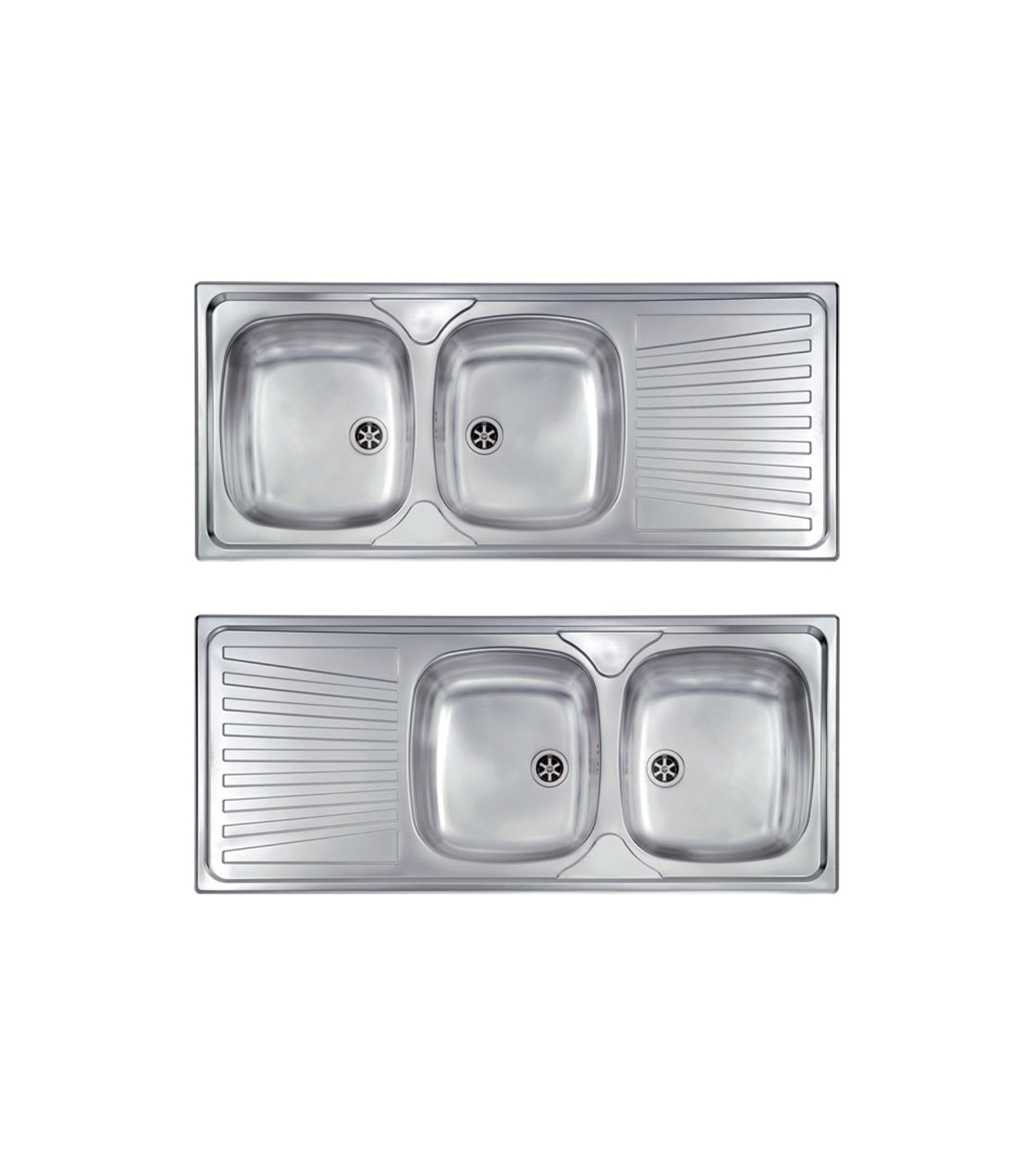 LAVELLO INOX AD INCASSO 2 VASCHE CON GOCCIOLATOIO MONDIAL 116x50 cm - DxDx - Sx (posizione gocciolatoio). Completo di pilette manuali con guarnizione premontata.