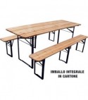 Set composto da tavolo e due panche con 3 gambe pieghevoli. Struttura in acciaio verniciato e piani in legno trattato. Con imballo integrale in cartone, specifico per le spedizioni con corriere.