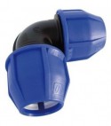 Gomito A Compressione Pn16 Mm 32X32In polipropilene. Anello in resina acetalica e O-Ring. Il sistema brevettato push permette il montaggio del raccordo senza dover smontare la ghiera.