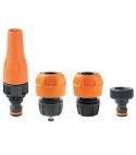 Con getto regolabile ed attacco rapido, in dotazione 1 raccordo portagomma Aquastop, 1 raccordo portagomma 'aperto', 1 presa al rubinetto con filettatura femmina da 3/4". Per tubi da Mm. 12 a Mm. 15 di diametro. Portata massima Lt./Min. 12 a 4 bar.