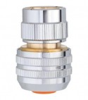 In ottone cromato. Provvisto di 6 sfere interne per assicurare un innesto automatico con una tenuta perfetta. La ghiera di serraggio, con il profilo di esclusivo design Claber, identifica il prodotto e ne accresce il grip.