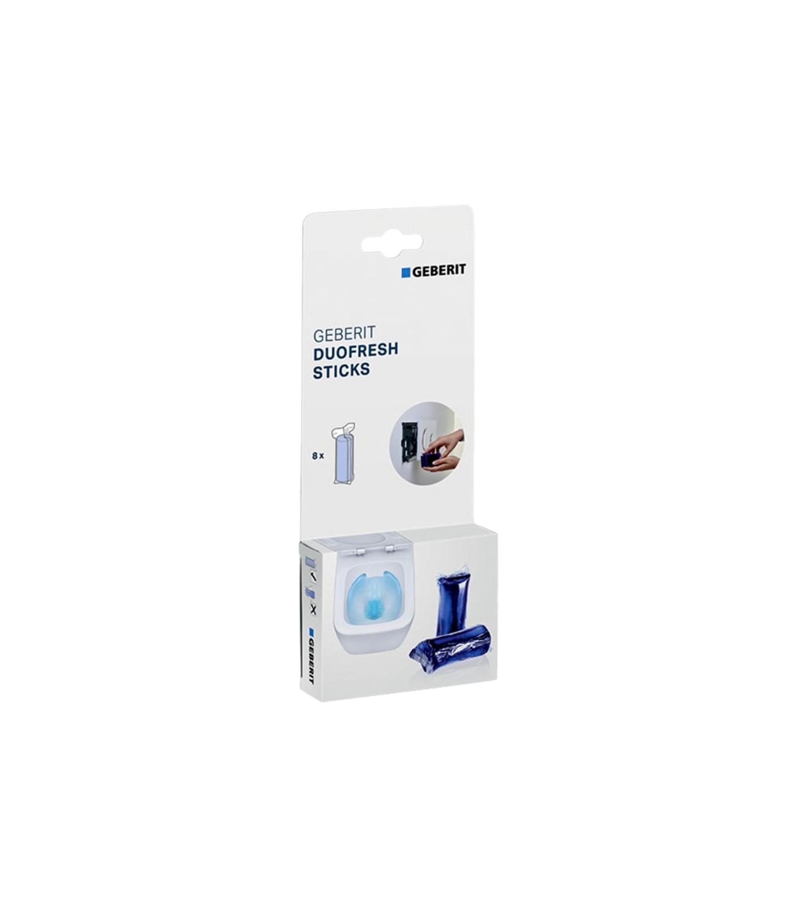 STICK IGIENIZZANTE PER SISTEMA DUOFRESH Scatola 8 PzScatola con 8 stick Geberit DuoFresh. Acqua di risciacquo, colore blu. Profumato, foglio protettivo, solubile in acqua. Biodegradabile.Rif: 244.600.00.1
