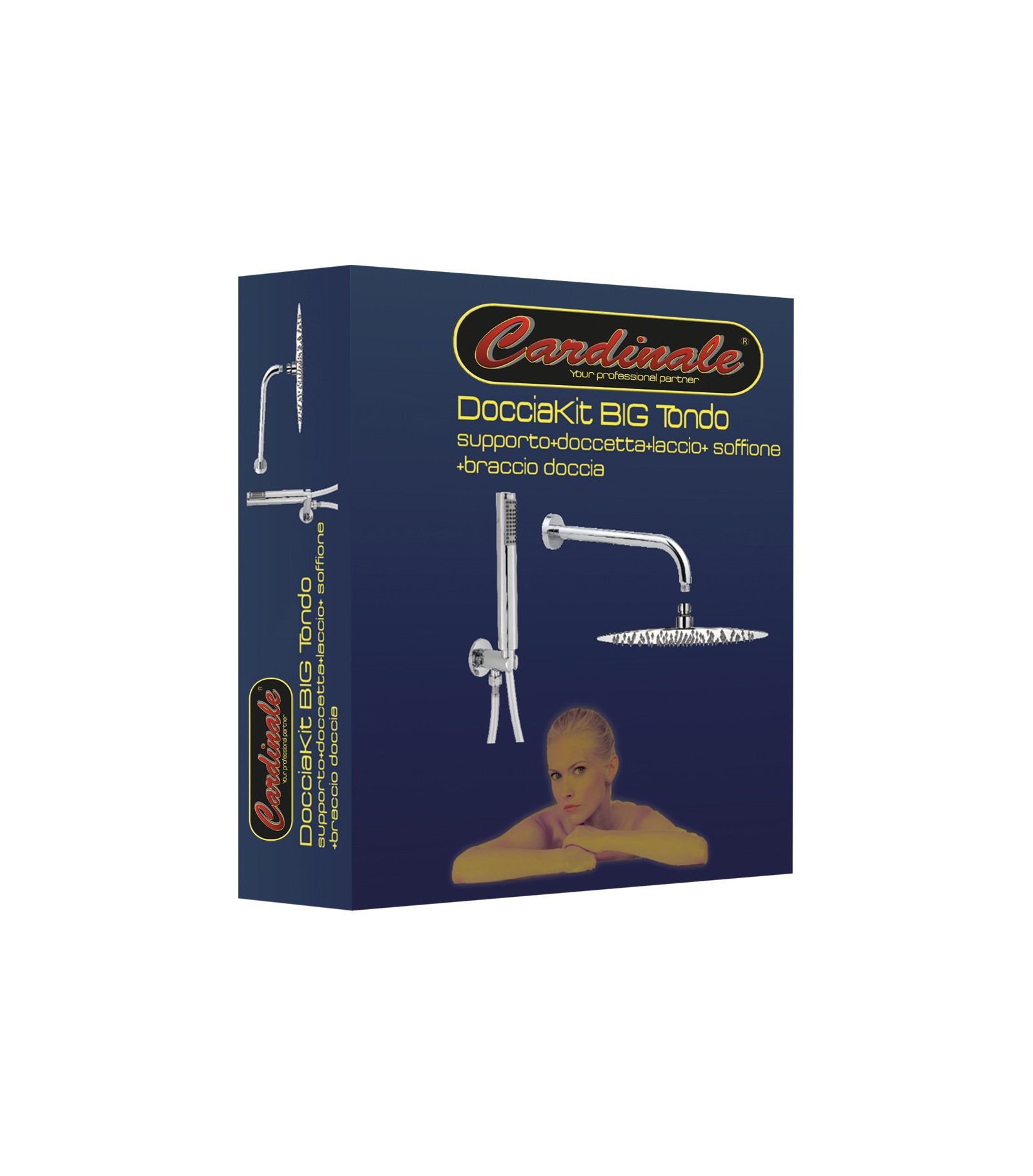 KIT DOCCIA BIG TONDO CROMO D.250 mmSet Composto da: - Presa acqua 1/2 - 1/2 in ottone,- Doccetta in ABS, - Laccio doccia in gomma da 150 cm, - Braccio doccia in Acciaio cm 30, - Soffione Slim H. 2 in acciaio Inox (misura variabile)