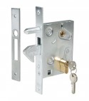 Con cilindro sagomato. Chiusura a 1 mandata e mezzo giro. Catenaccio a gancio con punta smussata e perno fisso Mm. 13x40. Quadro maniglia Mm. 8. Frontale in acciaio zincato con bordo quadro da Mm. 25x210. Altezza scatola Mm. 131,5. In dotazione: 3 chiavi piatte.