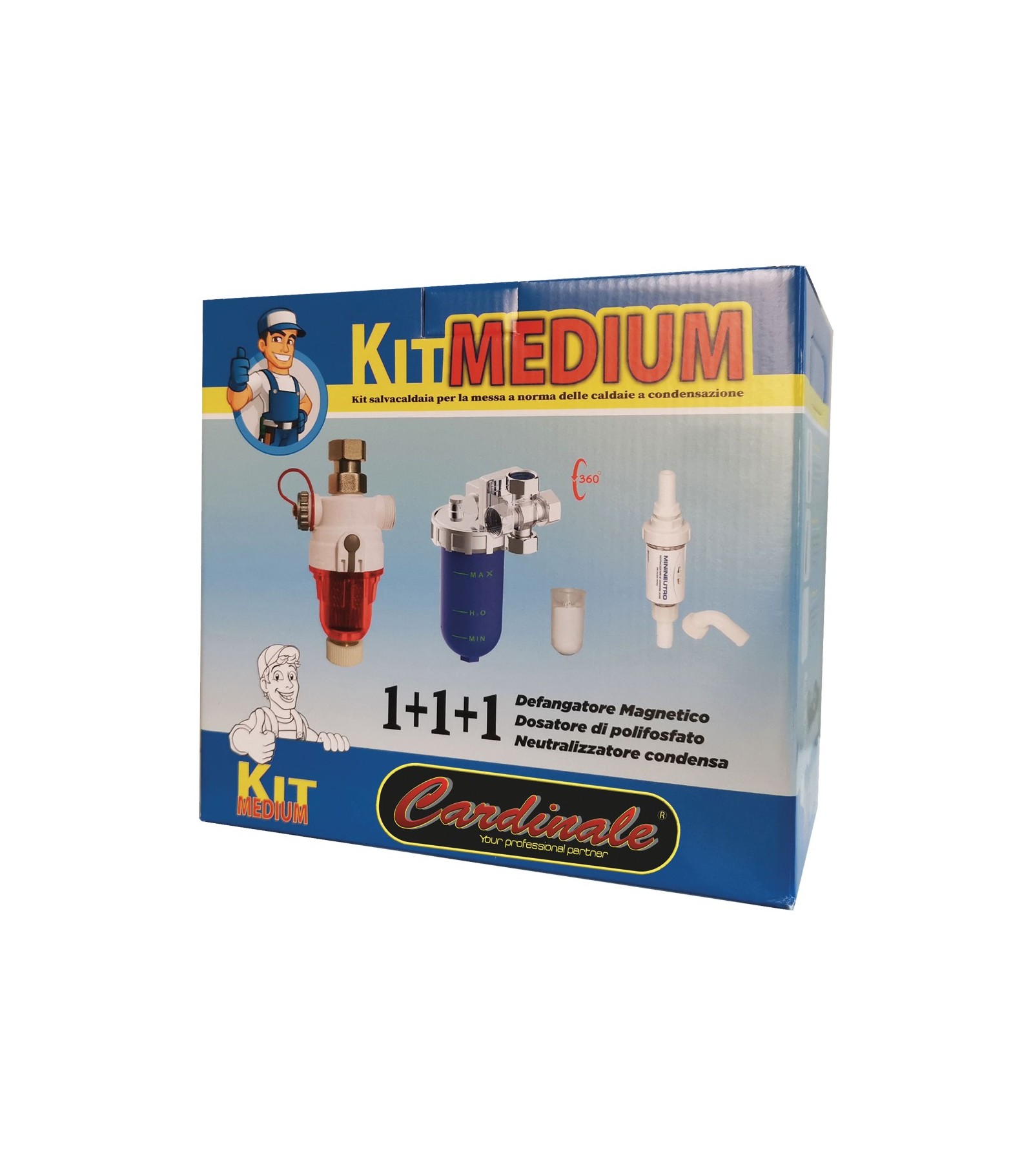 KIT SOTTOCALDAIA MEDIUM -Il kit comprende: - 1 Defangatore magnetico 3/4, - 1 Dosatore anticalcare 1/2 con by-pass, - 1 Cartuccia di neutralizzazione.