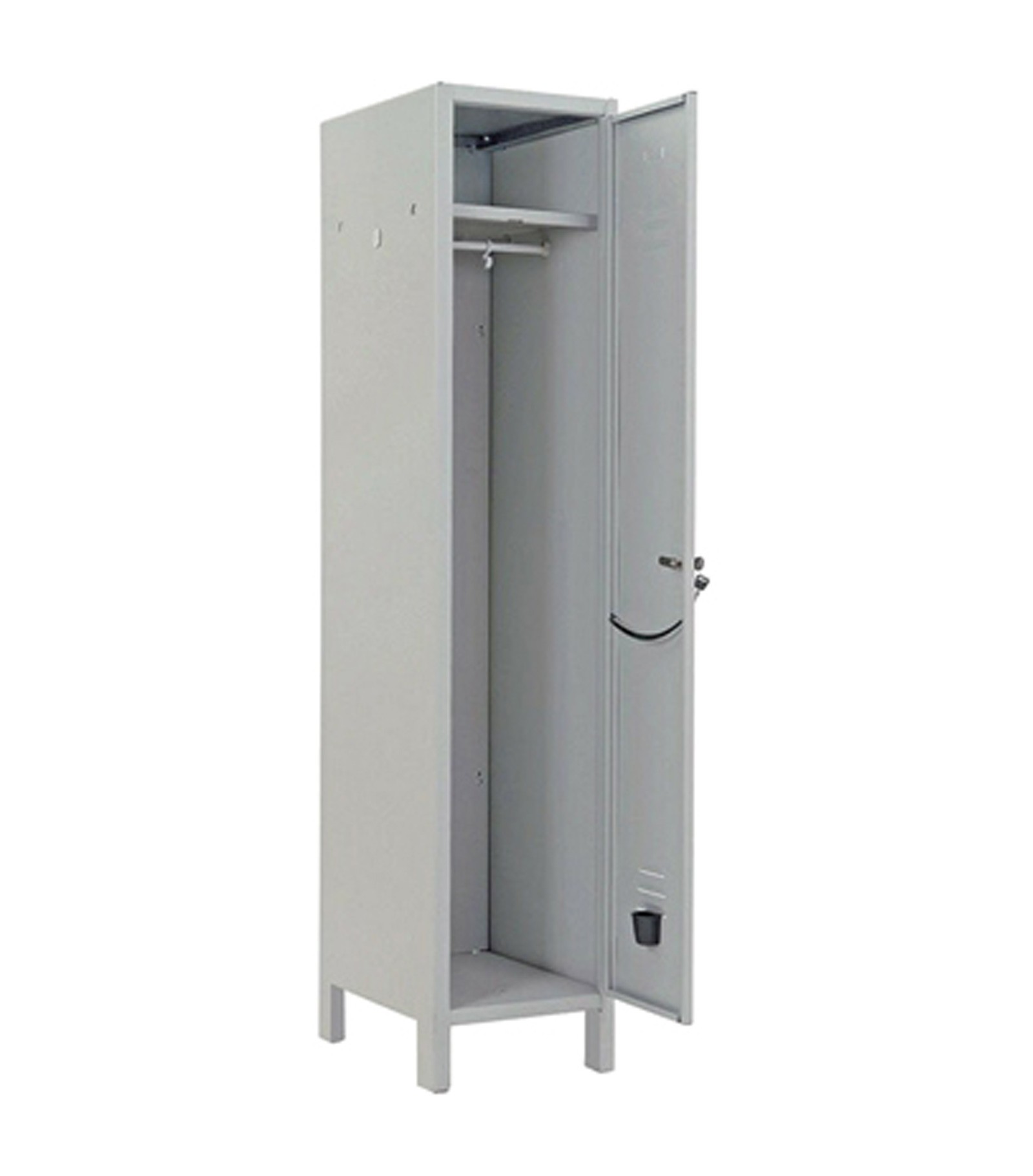 In lamiera di acciaio pressopiegata, con pretrattamento di fosfosgrassaggio e verniciatura a forno continuo. Colore grigio RAL 7035. Allestito con porta asciugamani, appendiabiti, ripiano interno, feritoie e porta ombrelli. Con serratura a cilindro. Da assemblare.