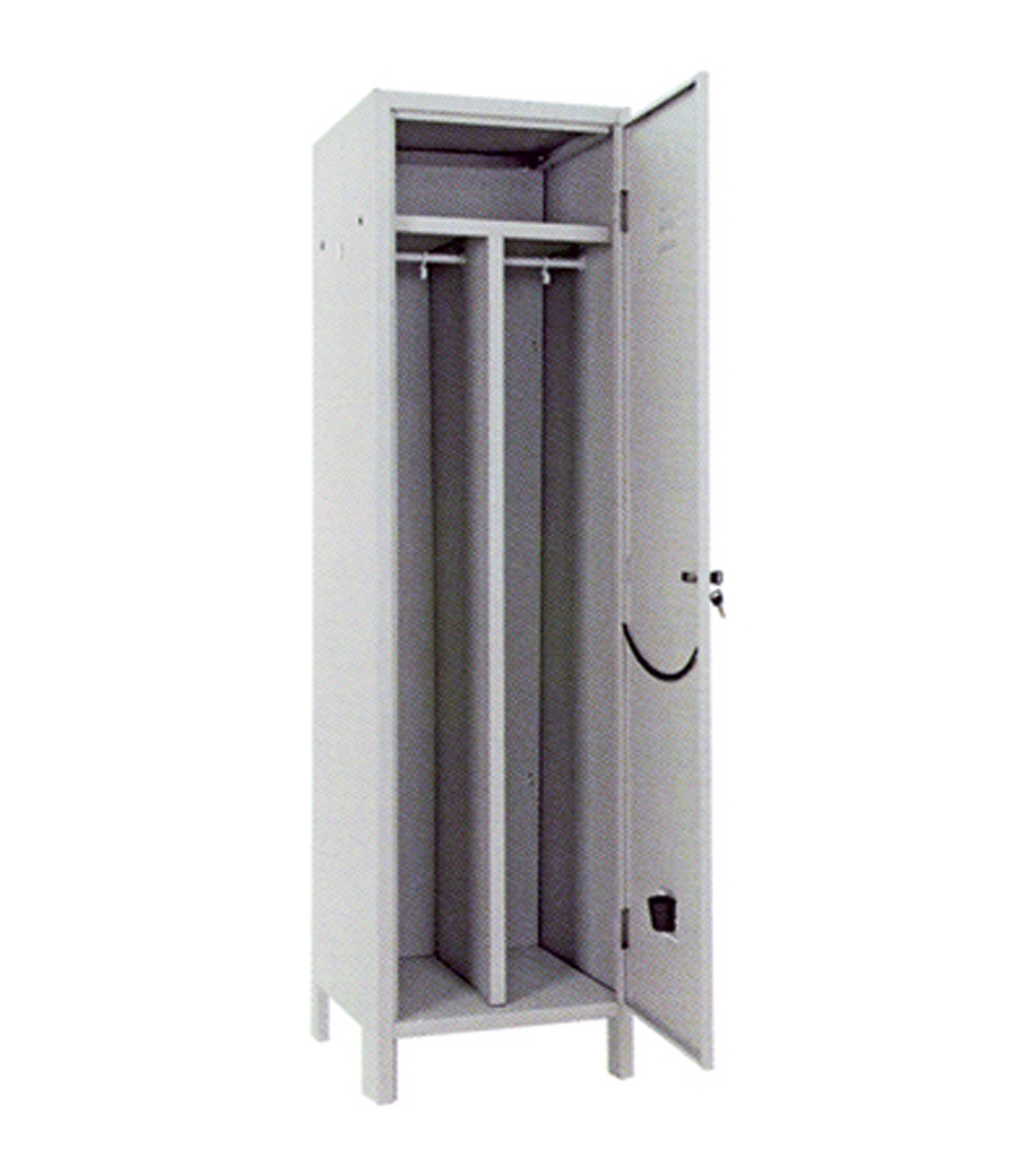 In lamiera di acciaio pressopiegata, con pretrattamento di fosfosgrassaggio e verniciatura a forno continuo. Colore grigio RAL 7035. Allestito con porta asciugamani, appendiabiti, ripiano interno, feritoie, portacartellino e paratia centrale. Con serratura a cilindro con doppia chiave in dotazione. Da assemblare.