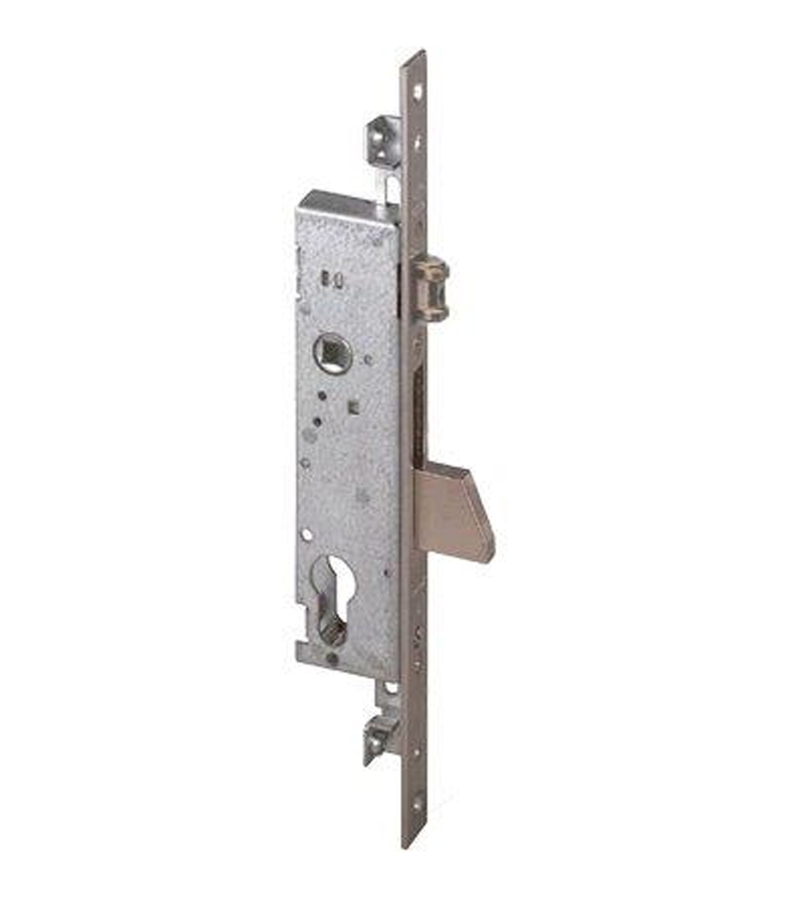 Per cilindro sagomato. Catenaccio e rullo. Chiusura triplice con catenaccio basculante a 1 mandata. Frontale in acciaio inox con bordo quadro da Mm. 22x290. Altezza scatola Mm. 172.
