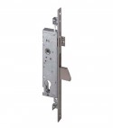Per cilindro sagomato. Scrocco reversibile e regolabile. Chiusura triplice con catenaccio basculante a 1 mandata e boccole filettate M8 per il fissaggio aste. Quadro maniglia Mm. 8. Frontale in acciaio inox con bordo quadro da Mm. 22x290. Altezza scatola Mm. 172. In dotazione: viti di fissaggio per serratura e cilindro.