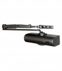 Serie 'Smart Plus 2'. Corpo monoblocco in lega di alluminio pressofuso con cover in ABS removibile. Braccetto in acciaio con arresto. Meccanismo a pignone e cremagliera in acciaio temprato. Con regolazione della velocit di chiusura e della potenza del colpo. Per porte da Mm. 85 a Mm. 1100 di larghezza e peso da Kg. 40 a Kg. 80.
