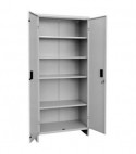 In lamiera di acciaio pressopiegata, con pretrattamento di fosfosgrassaggio e verniciatura a forno continuo. Colore grigio RAL 7035. Con doppia anta e serratura. Da assemblare.
