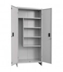 In lamiera di acciaio pressopiegata, con pretrattamento di fosfosgrassaggio e verniciatura a forno continuo. Colore grigio RAL 7035. Con doppia anta, 1 ripiano grande, 3 mensole piccole e serratura.