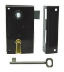 A mappa. Scrocco. Chiusura con catenaccio a 2 mandate. Quadro maniglia Mm. 6. Altezza scatola Mm. 110. In acciaio verniciato marrone. In dotazione: 1 mostrina, 1 bocchetta e 2 chiavi patent.