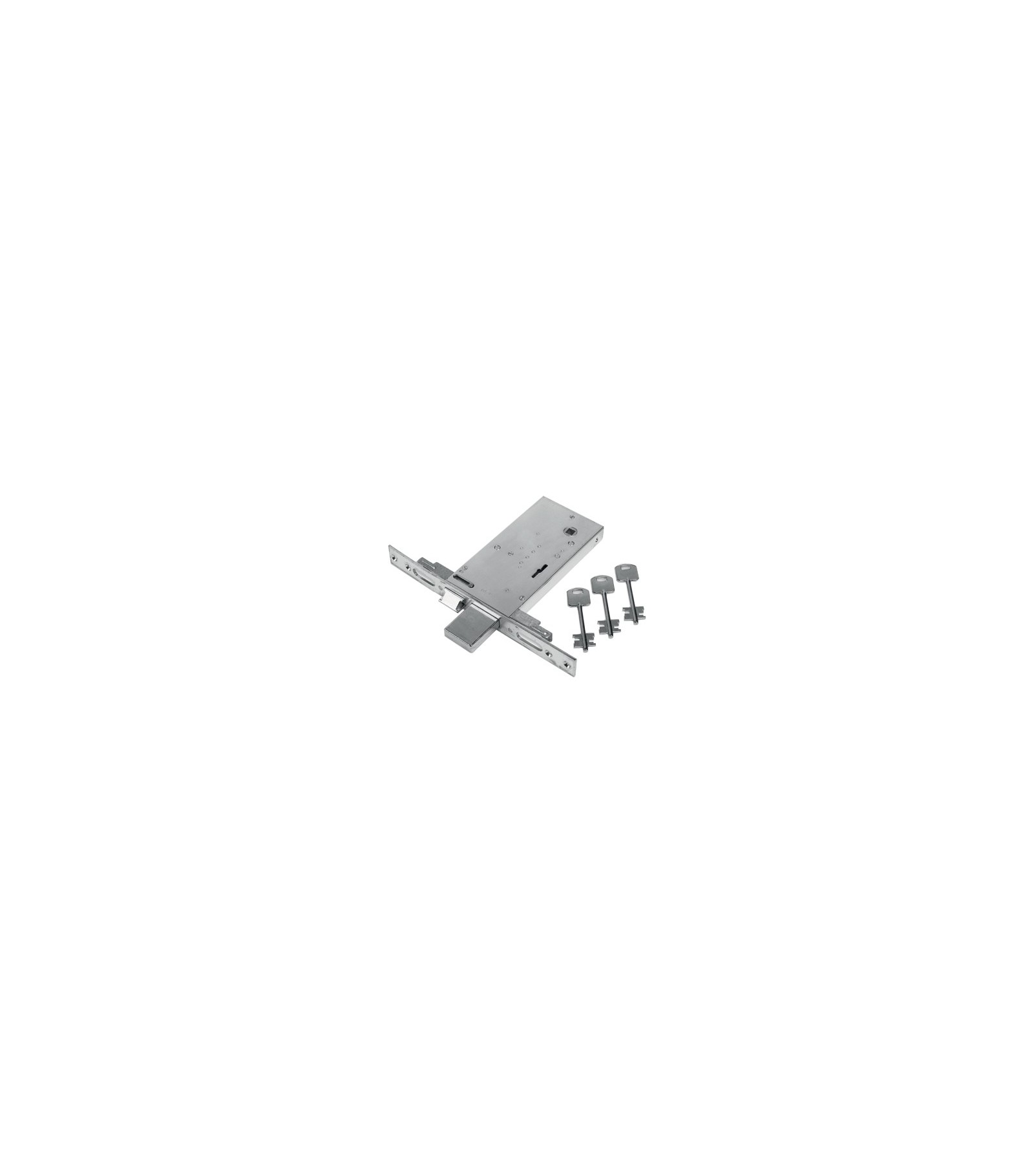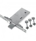 A doppia mappa. Con scrocco reversibile. Chiusura triplice con catenaccio a 4 mandate e asole per montaggio aste. Frontale in acciaio inox con bordo quadro da Mm. 25x240. Altezza scatola Mm. 81. In dotazione: 3 chiavi.