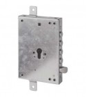 Per cilindro sagomato. Scrocco reversibile, azionabile da chiave o maniglia. Chiusura triplice con catenaccio a 4 pistoni e 2 mandate, sporgenza Mm. 3 e corsa Mm. 29, e predisposizione per fissaggio aste, corsa Mm. 20. Quadro maniglia Mm. 8, interasse Mm. 85. Scatola Mm. 136x206. In acciaio zincato. Completa di supporto e viti di fissaggio per cilindro. Compatibile 85571/28 Mottura.