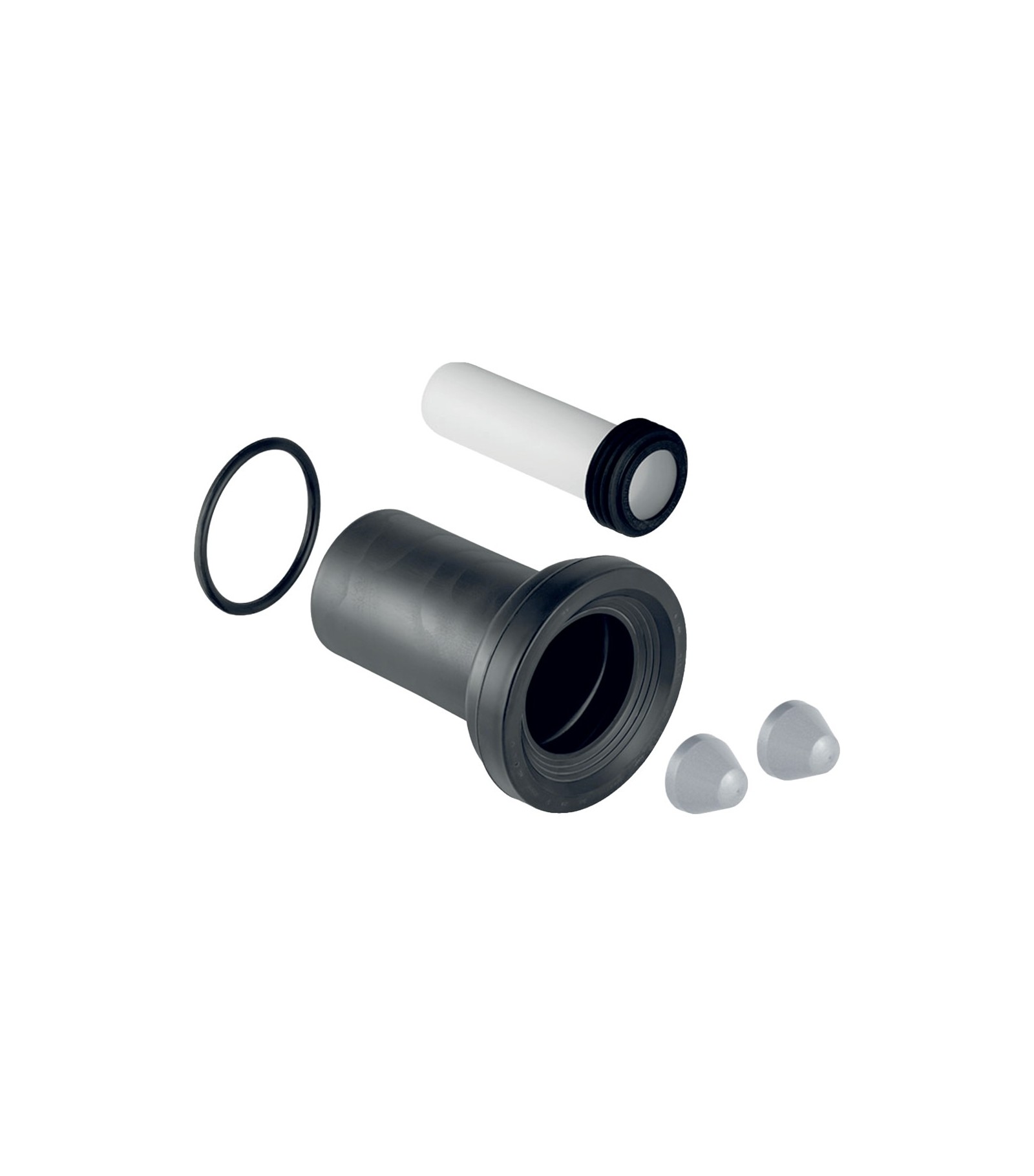 Per vasi sospesi. Materiale in Dotazione: Tubo di risciacquo con morsetto in PE-HD + Raccordo diritto con morsetto in PP + Guarnizione alabbro in EPDM + 2 Cappucci di copertura + Materiale Di fissaggio.