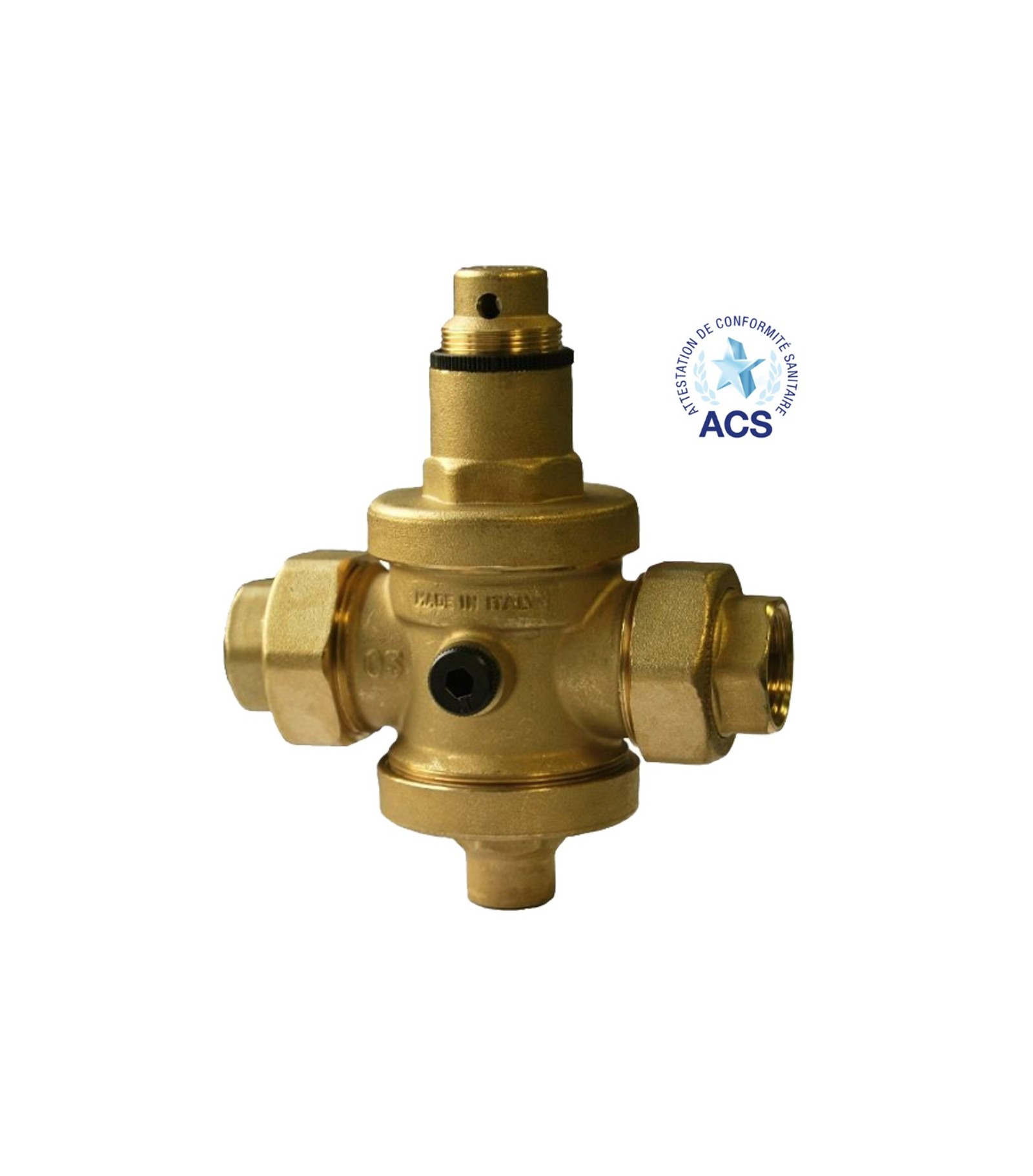 Riduttore di pressione in ottone con raccordi a bocchettone FF, funzionamento a pistone e sistema della compensazione della pressione a valle, sede in acciaio inox. Pressione massima: 25 bar.