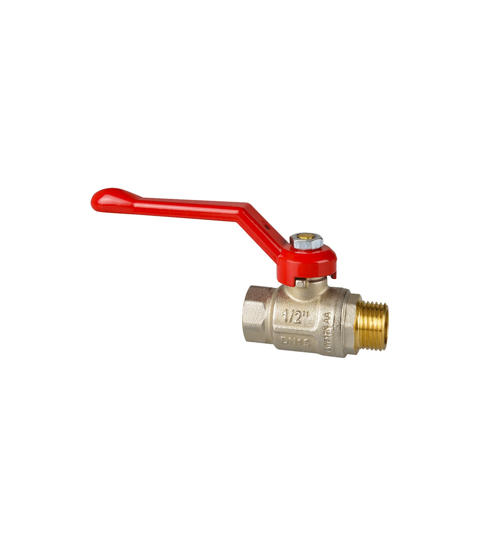Valvola a sfera a passaggio totale, Leva in alluminio verniciato rosso, Filettatura M/F, Asta comando antiscoppio doppio O-ring. Idonea per acqua in impianti di riscaldamento/raffrescamento. Filettatura ISO 228.
