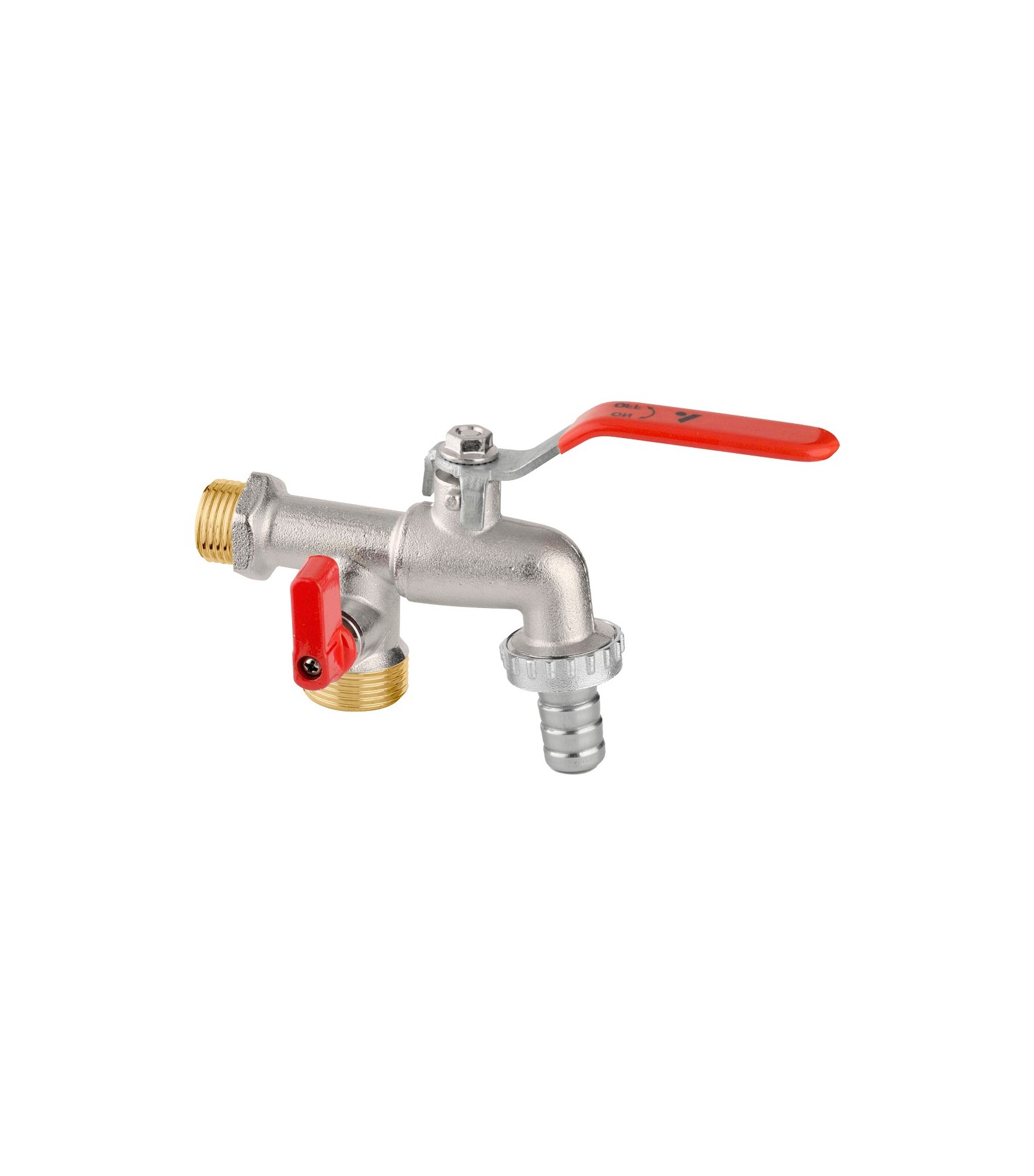 RUBINETTO PORTAGOMMA A SFERA DUPLEX APM 1/2x3/4x3/4 - PN16Rubinetto a sfera da giardino doppio con portagomma e minivalvola. Con Leva piatta rossa in Acciaio.Rif: 2040ST015