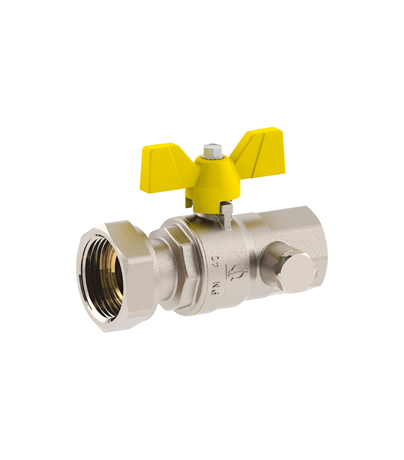 Valvola a sfera per gas nichelata, attacco Femmina-Dado girevole, con attacchi di pressione, con maniglia a Farfalla in alluminio verniciata gialla.