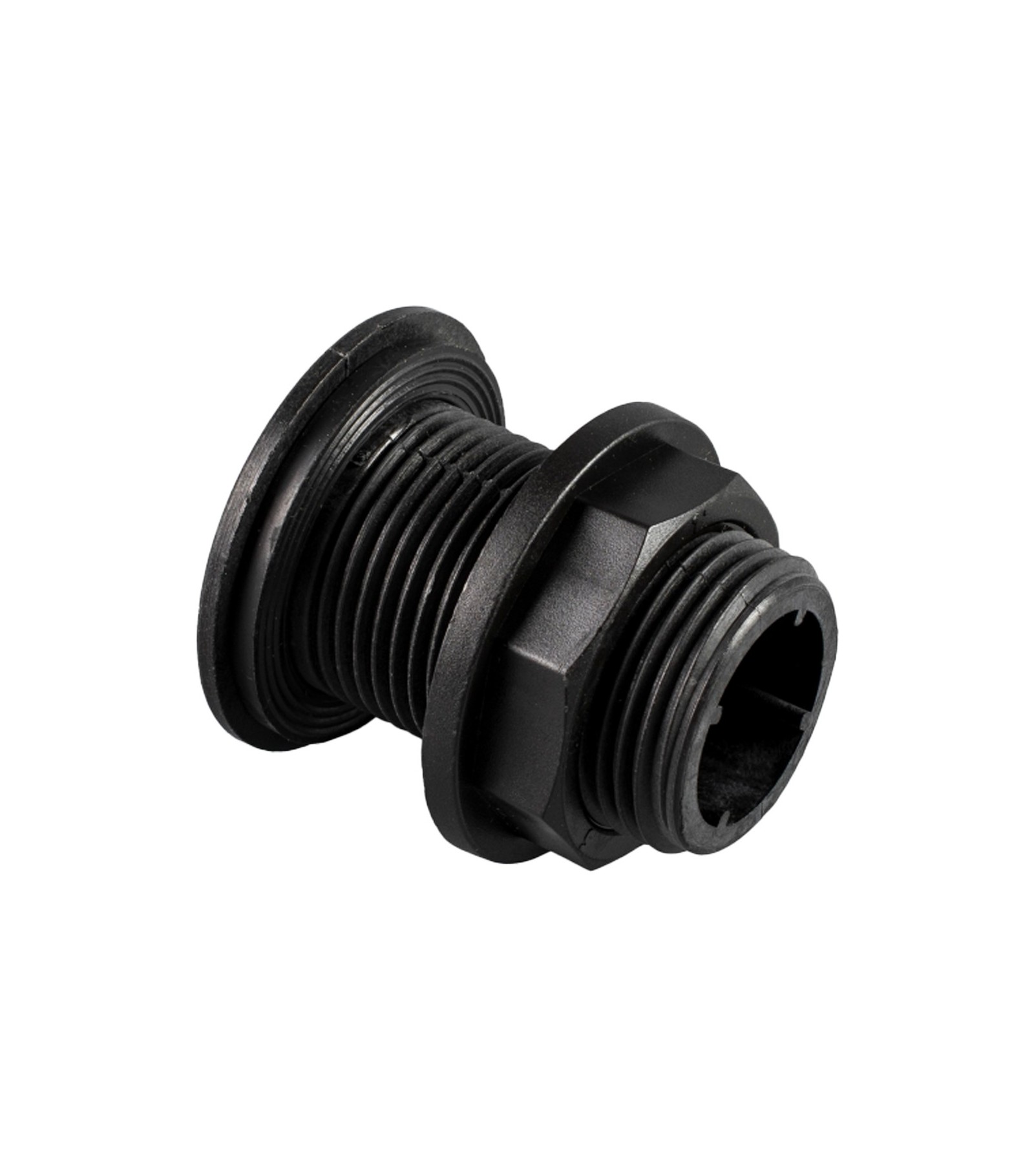 Una estremità maschio filettata ed una munita di collare di serraggio e guanzione Piana in EPDM. Guarnzione spessa per compensare le ondulazioni della parete del contenitore. Pressione di esercizio: 10 bar a 20D.C. Standard di connessione: Filettatura esterna GAS cilindrico UNI ISO 228/1. Temperatura massima di esercizio: 80D.C. Materiali: Polipropilene (PP) EPDM Colori: Nero (RAL 9011)