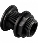 Una estremità maschio filettata ed una munita di collare di serraggio e guanzione Piana in EPDM. Guarnzione spessa per compensare le ondulazioni della parete del contenitore. Pressione di esercizio: 10 bar a 20D.C. Standard di connessione: Filettatura esterna GAS cilindrico UNI ISO 228/1. Temperatura massima di esercizio: 80D.C. Materiali: Polipropilene (PP) EPDM Colori: Nero (RAL 9011)