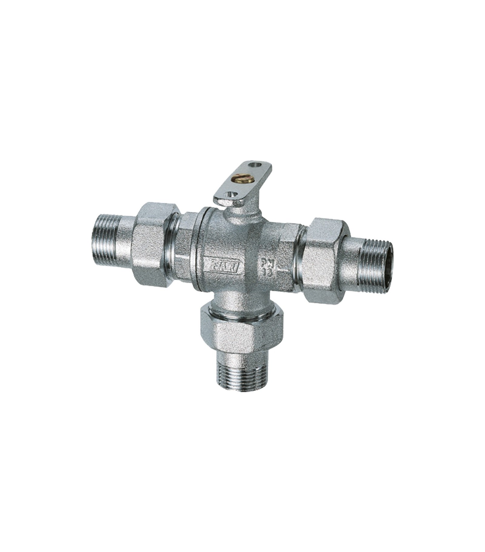 Valvola di zona deviatrice a 3 vie MOTORIZZABILE cromata a sfera. - Corpo valvola a sfera: ottone CW617N. - Guarnizioni di tenuta: O-Ring in EPDM e sedi in PTFE. - Pressione nominale: 16 bar. - Pressione massima differenziale: 5 bar. - Temperatura fluido: -10D.C (con antigelo) + 100D.C. - Fluidi utilizzabili: acqua e acqua con glicole. - Attacchi: maschio-maschio. - Passaggio totale.