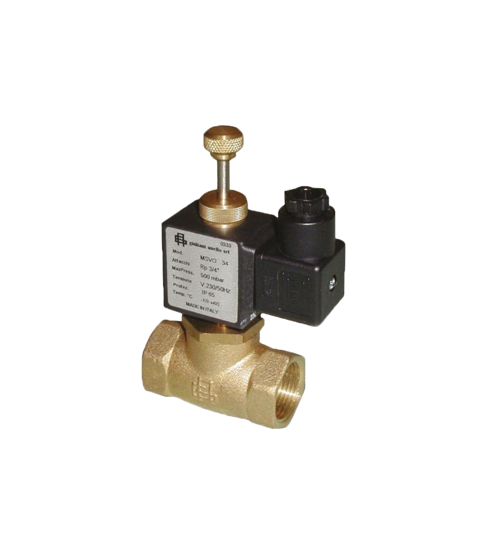 Elettrovalvola per gas normalmente chiusa a riarmo manuale con attacchi filettati. Corpo in ottone. Bobina con connettore IP65. Idonea per gas manifatturati, gas naturali, gas di petrolio liquefatto (gpl), per gas non aggressivi e aria. Temperatura di esercizio: - 20- 60D.C. Pressione massima di esercizio:0,5 bar