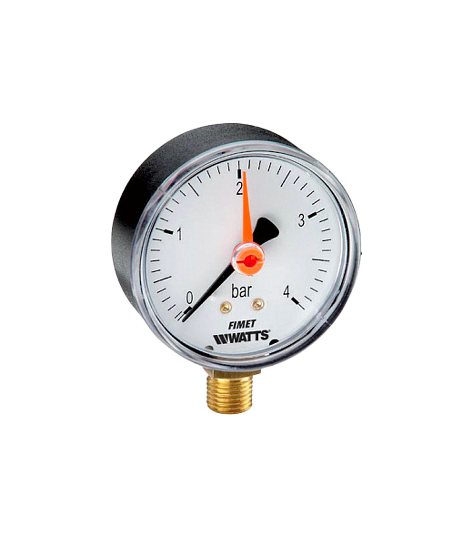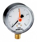 Manometri a molla tubolare Bourdon Serie M1-ABS/R, marca WATTS, per impianti termosanitari, gas e liquidi non viscosi, non aggressivi e che non cristallizzano. Cassa in plastica a secco DN 63 mm, attacco radiale, indice rosso sul trasparente.