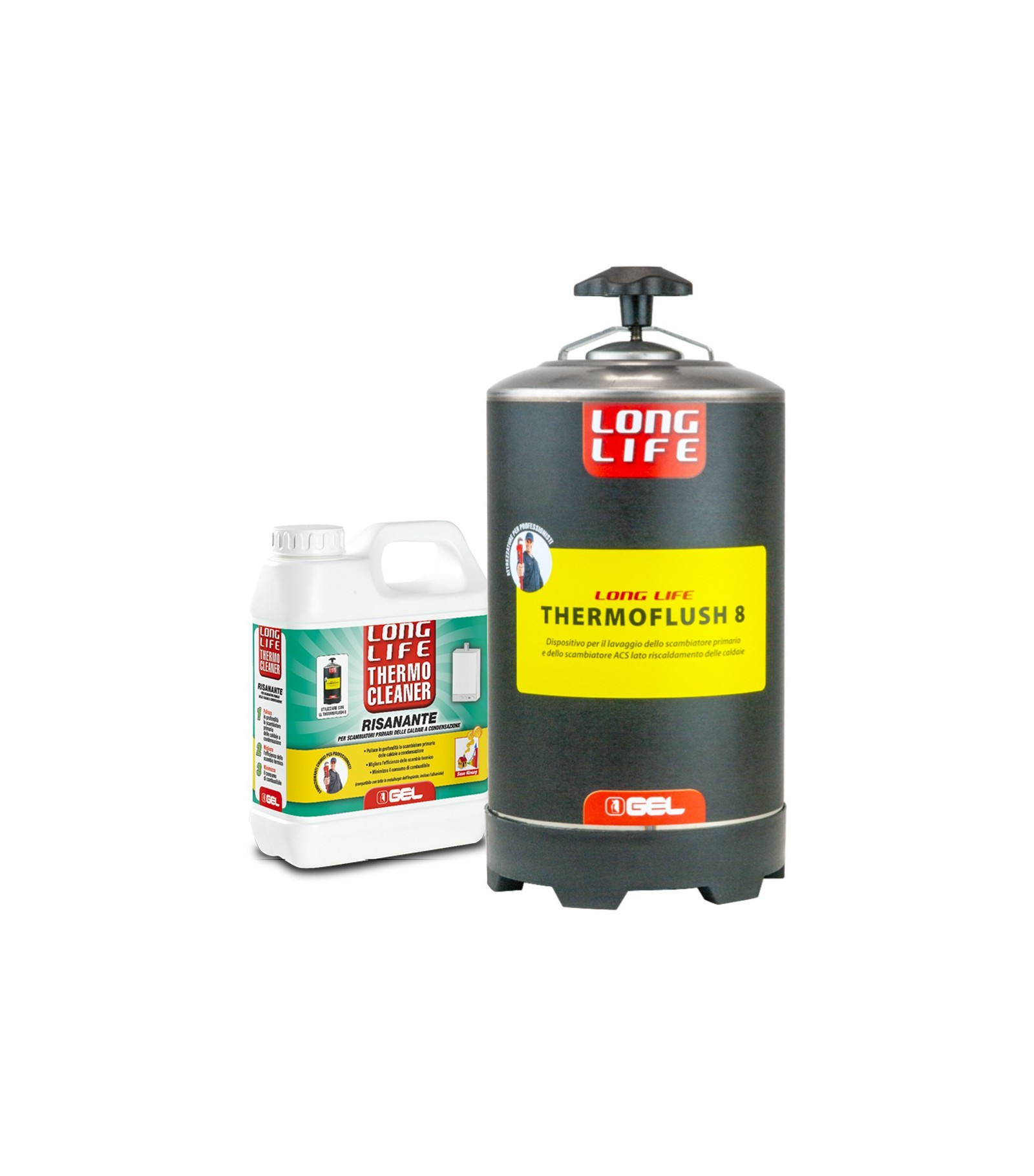 Prodotto liquido, pronto all'uso, per la pulizia dello scambiatore primario delle caldaie a condensazione. Compatibile con tutti i metalli compreso l'alluminio. Modalità d'uso: - Depressurizzare l'impianto e collegare IN/OUT della caldaia - Caricare il prodotto LL Thermo Cleaner - Caricare l'impianto, pressurizzare a 1 bar, accendere la caldaia e far circolare con funzione riscaldamento attiva a temperatura max 50 D.C - Durante il lavaggio (2/8 ore) aprire il rubinetto ACS e far scorrere per 15/30 minuti. In questo modo il prodotto pulirà anche lo scambiatore secondario, la valvola a 3 vie e il circolatore NOTA BENE. Questo lavaggio pu• essere effettuato contemporaneamente al lavaggio del circuito termico con le pompe LL SuperFlush. Comprende il dispositivo THERMOFLUSH + 1 lt. Long life Thermo Cleaner.