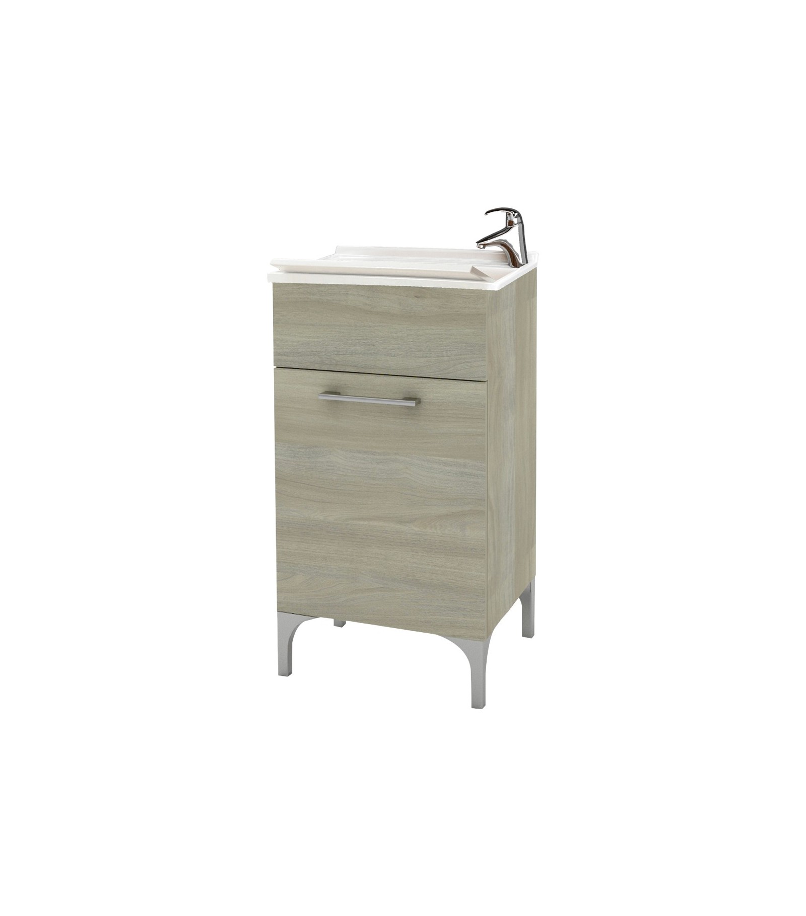 MOBILE LAVATOIO AD 1 ANTA ROVERE GRIGIO L.45 x P.50 x H.83 cmBordi in ABS, piedini regolabili cromati, maniglie in ABS cromate. Lavabo in plastica dura.Rif: 4497