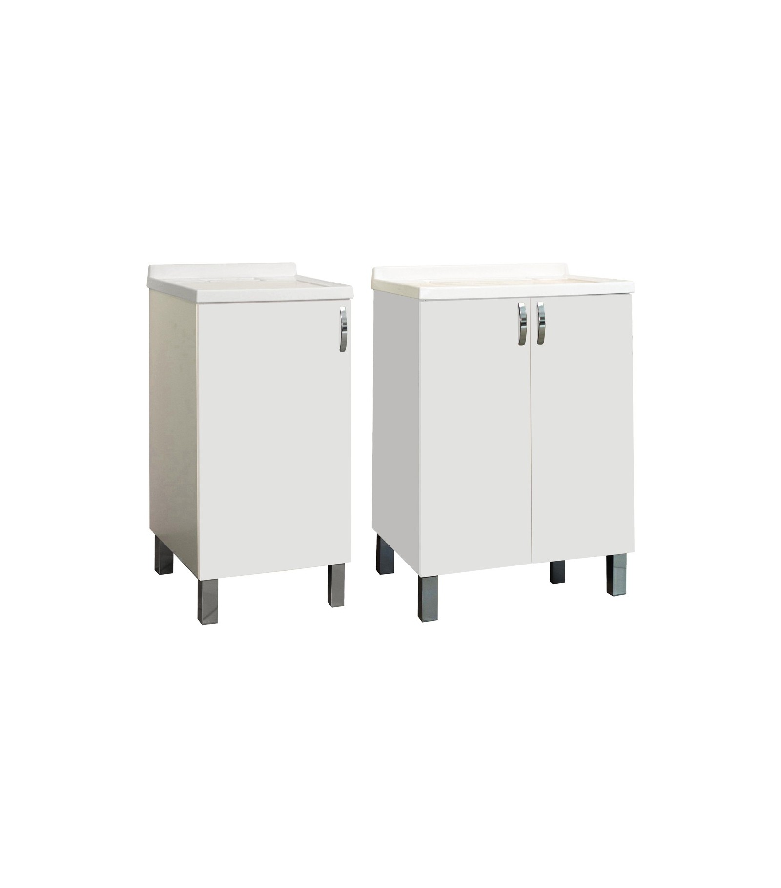 Mobile lavatoio in nobilitato 18 mm idrofugo bianco, vasca in resina PP resistente a tutti gli acidi.