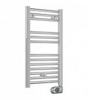 Radiatore da bagno in acciaio completamente elettrico dotato di termostato. Collettori laterali 40x30 mm e tubi orizzontali dm 22 mm saldobrasati con elementi di fissaggio. Con termostato digitale, con funzioni: Comfort (mantiene la temperatura ambiente al valore impostato), Crono ( programmazzione giornaliera con ripetizione settimanale), 2h ( Funzionamento alla massima potenza per 2 h indipendentemente dalla temperatura impostata), Rilevamento finestre aperte ( il termostato si disattiva per un max di 30 min., nel caso di apertura di una finestra nella stanza), Antigelo (mantiene la termperatura ambiente sopra i 7D.C), Notte ( mantiene una temperatura dal valore ridotto rispetto alla modalità Comfort).
