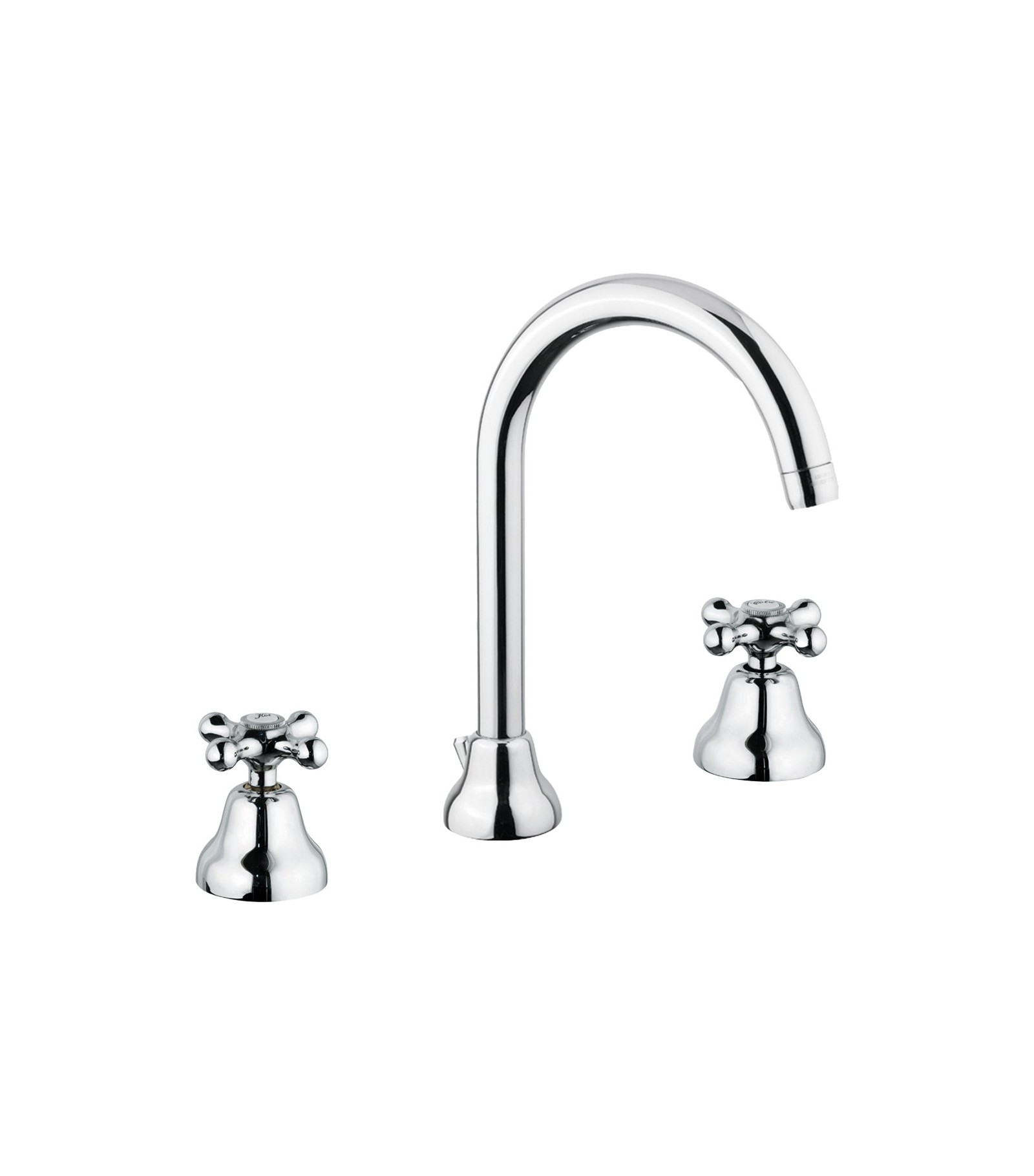 Rubinetteria per lavabo a 3 Fori. Fornito completo di piletta di Scarico da 11/4 e flessibile di raccordo idrico da 1/2. Con canna alta, H. 277 mm. Finitura: Cromo Per renderlo a chiusura ceramicata ordinare nostro codice: 0423202