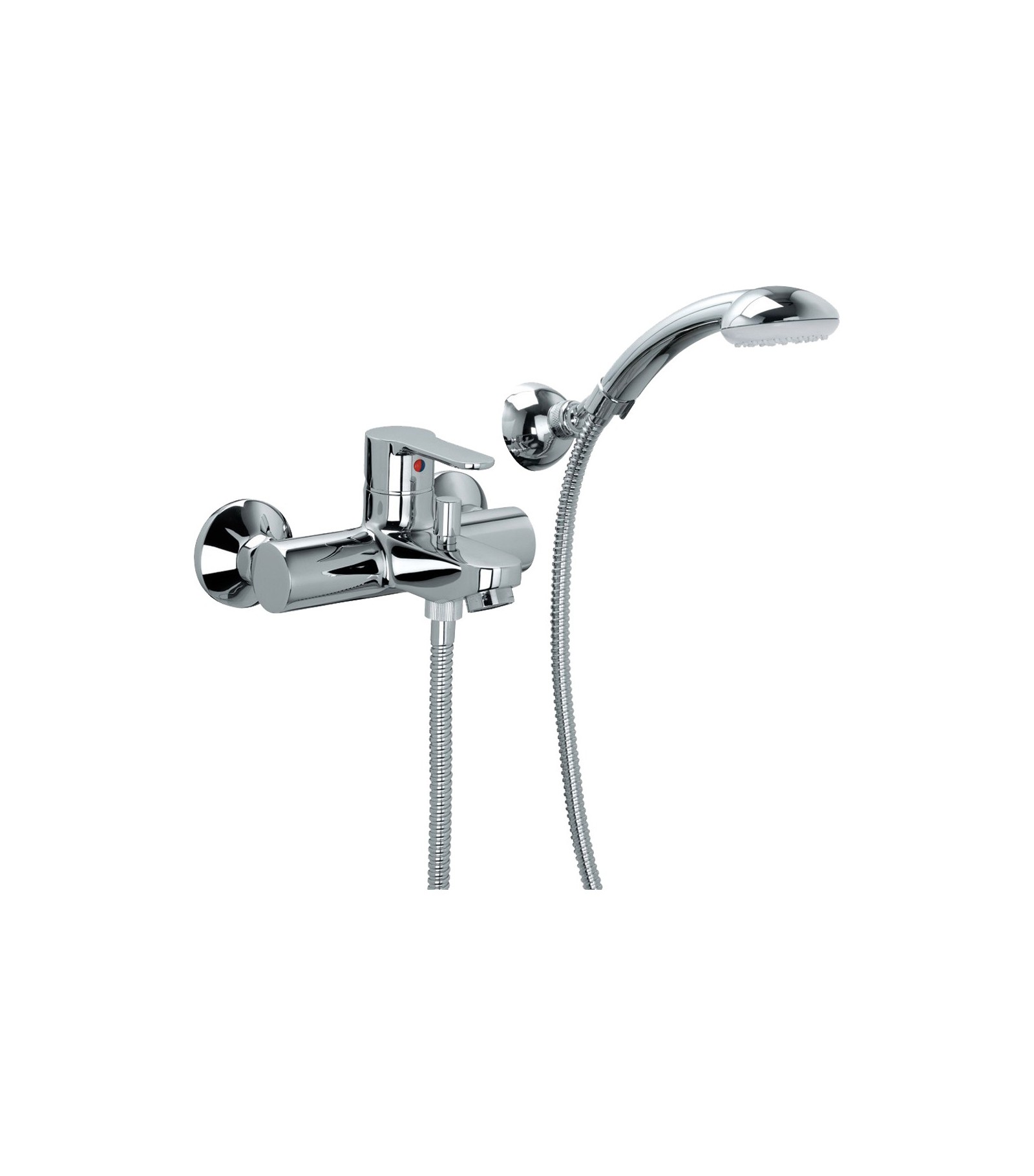 Miscelatore vasca/doccia con deviatore. Fornito completo di: - Aereatore M28x1, - Set 2 eccentrici 1/2x3/4 G, - Rosoni, - Doccetta, - Flessibile doccia. Con supporto a muro snodato. Cartuccia di ricambio nostro codice: 04190