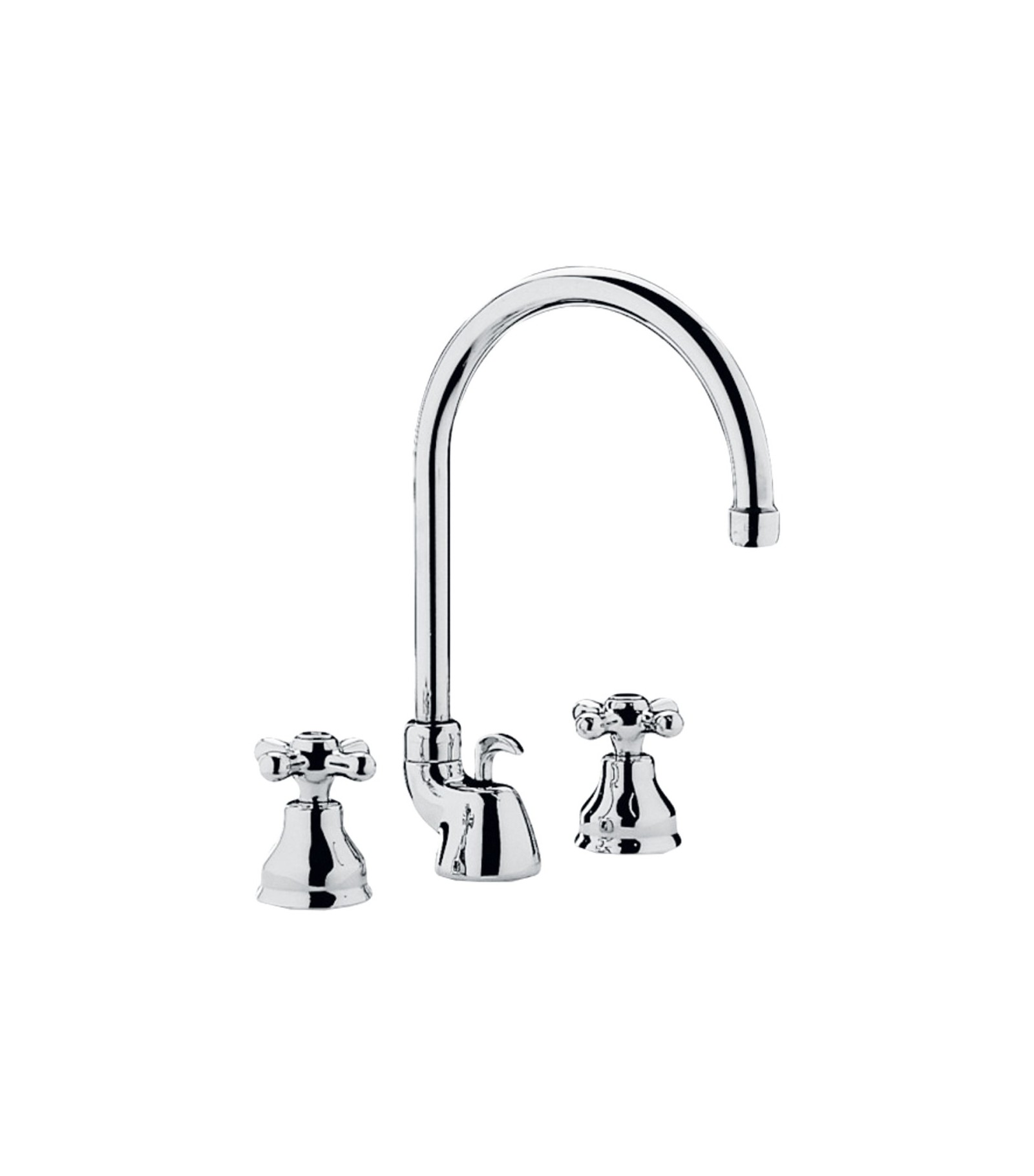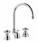 Serie Iris Batteria lavabo con canna orientabile, rubinetteria stile Tradizionale. Fornito completo di: - Piletta di scarico automatico 11/4 G, - Aereatore M22x1 - Set 2 Flessibili Inox 1/2 G. Vitoni in ceramica di ricambio nostro articolo 04186.