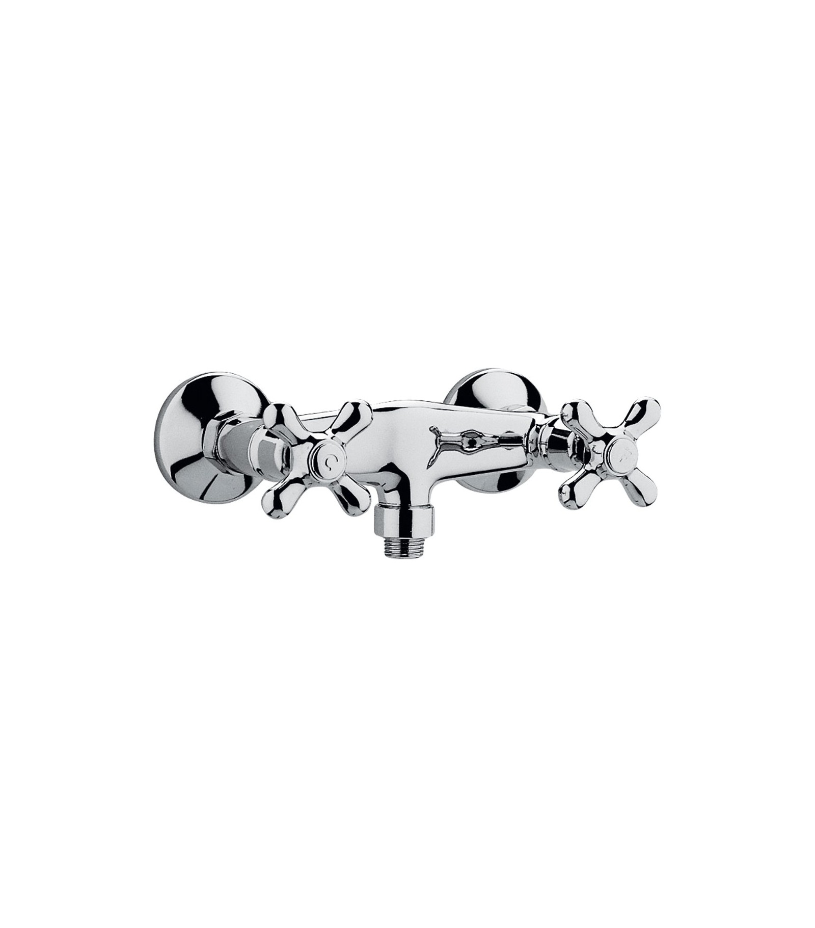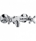 Gruppo doccia per installazione esterna dalla parete. Rubinetteria stile Tradizionale, Serie Iris PAFFONI. Senza set doccia. Fornito completo di: - Attacco Inferiore 1/2 G, - Set 2 eccentrici 1/2 x 3/4 G e rosoni. Vitoni in ceramica di ricambio nostro articolo 04186.