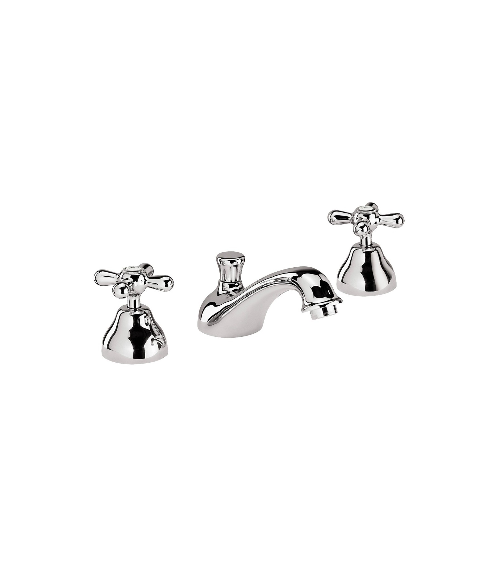 BATTERIA LAVABO A TRE FORI LIBERTY Cromo + Piletta 11/4Batteria lavabo 3 fori, con manopole a croce. Finitura: Cromo Stile rubinetteria tradizionale. Fornito completo di Piletta di scarico automatico da 11/4. Con Vitone ceramicato.Rif: 17CR211