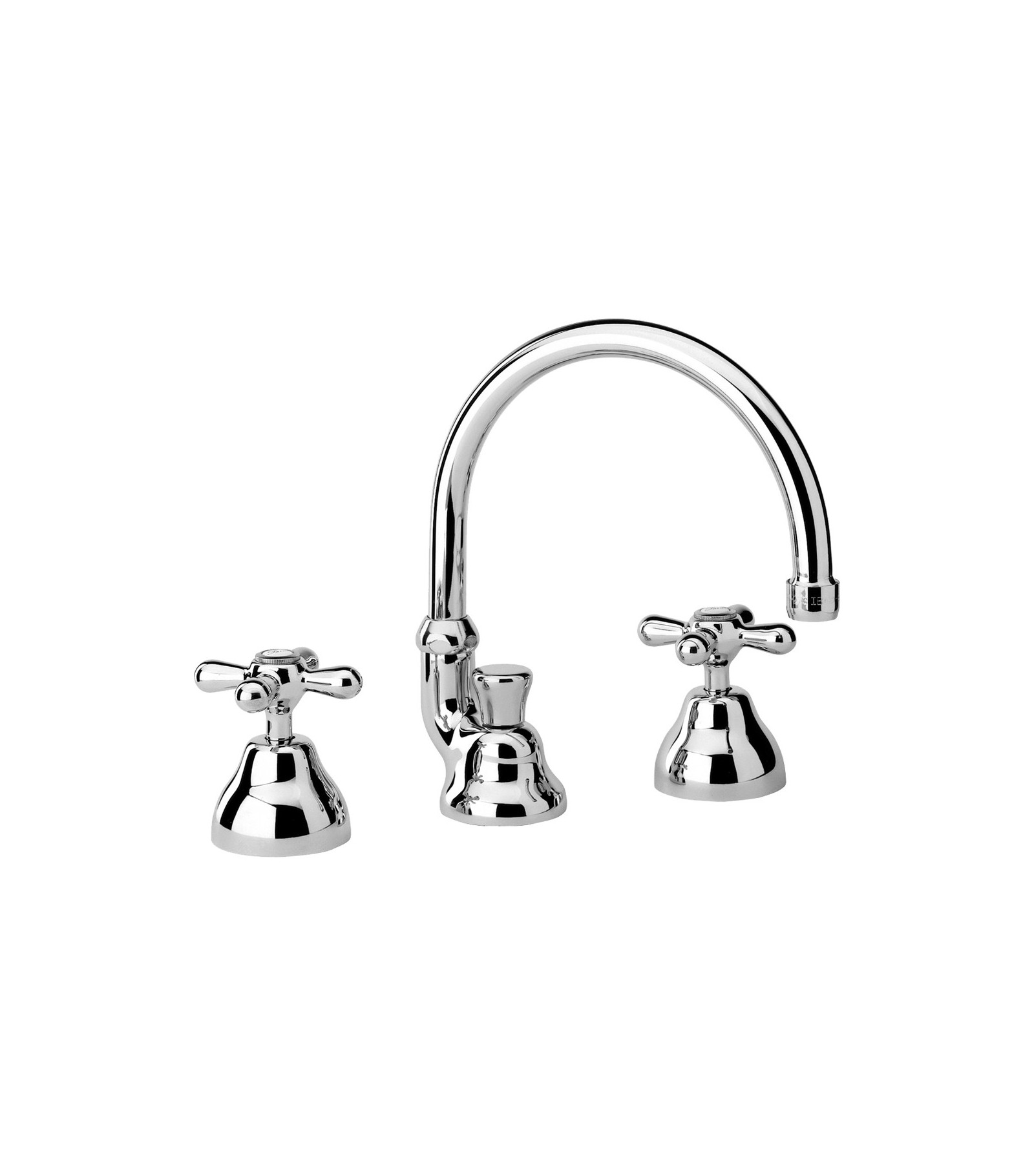Batteria Lavabo 3 fori, con manopole a croce e canna alta orientabile. Finitura: Cromo Stile rubinetteria tradizionale. Fornito completo di Piletta di scarico automatico da 11/4. Con Vitone ceramicato.