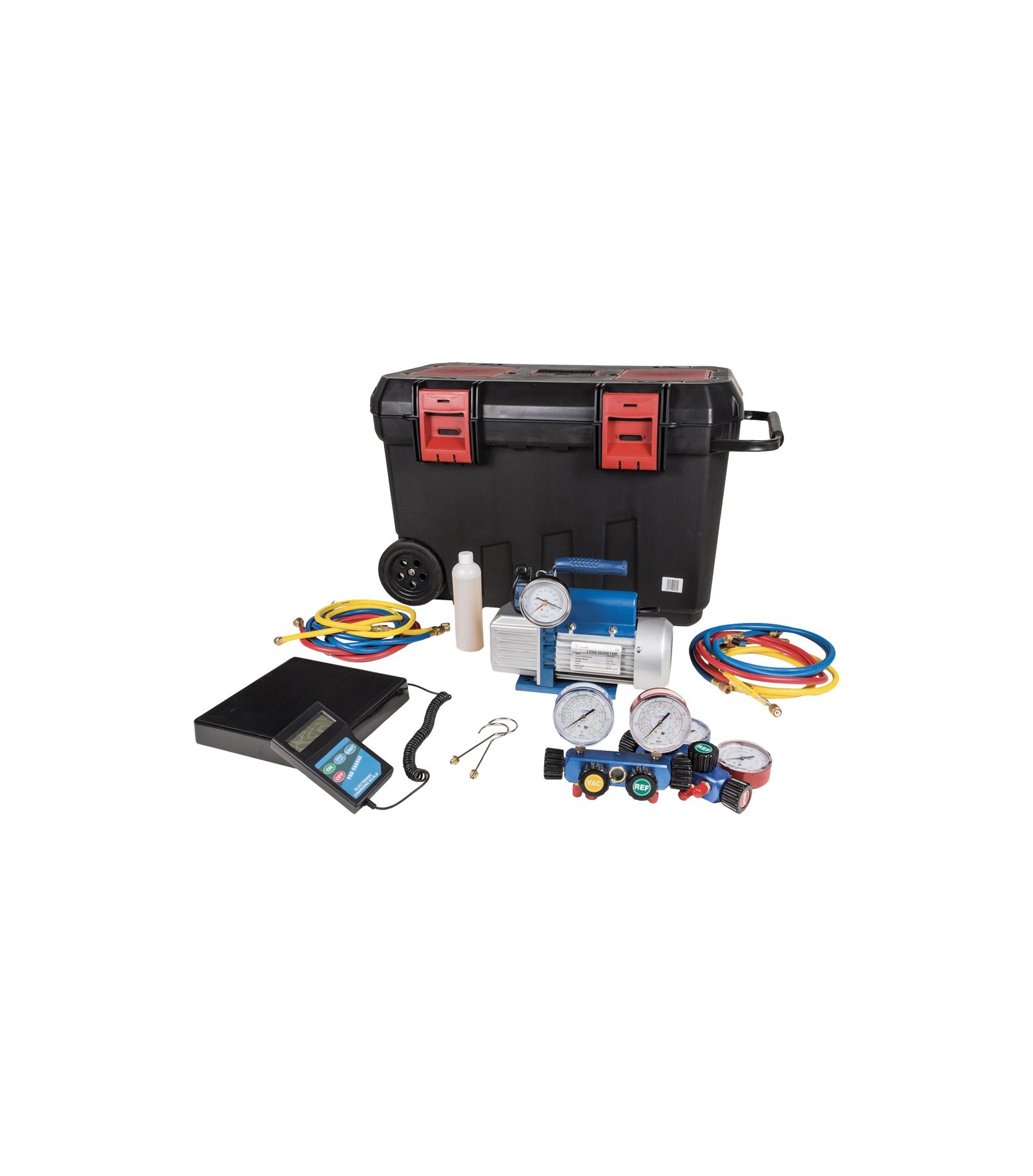 Sistema di vuoto ricarica multigas comprende: Pompa vuoto mono stadio con elettrovalvola dotata di 2 monometri con scale R410-R32/ R22-R407 e 2 serie tubi flessibili.