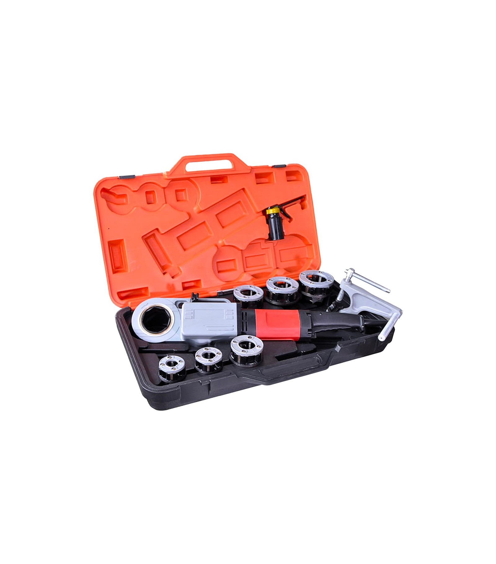FILIERA ELETTRICA PORTATILE 1/2 ÷ 2Completa di staffa fermaspunto. Capacità di filetto da 1/2 a 2. Fornite in cassetta metallica, bussole da 1/2 - 3/4 - 1-1 1/4 - 1 1/2 - 2, staffa ferma tubo. Alimentazione 220V. Potenza 1350W - 9Kg.