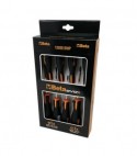 In acciaio cromato. Punta con finitura nera, protetta dall'ossidazione con un trattamento di fosfatazione. Impugnatura ergonomica bimateriale. Impronta e misura sono riportate sulla calotta sferica dell'impugnatura. Composto da 8 giraviti: 5 a taglio (2,5x50, 3x75, 4x100, 5,5x100 e 6,5x150) e 3 Phillips (PH0x60, PH1x80 e PH2x100).