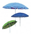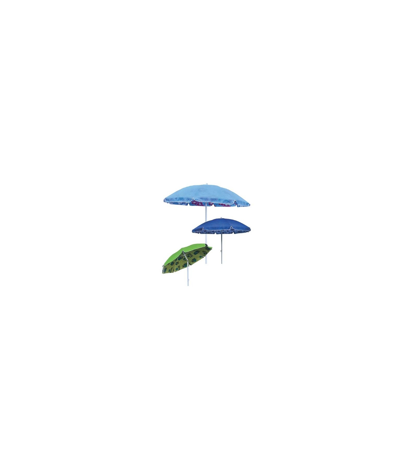 Palo in alluminio verniciato bianco con diametro da Mm. 32, e 8 stecche fibra di vetro con snodo in plastica. Copertura in poliestere duplex da Gr./Mq. 150. Diametro Cm. 200. Inclinabile. Con borsa a tracolla in polietilene. Coperture in 3 colorazioni assortite: blu, celeste e verde.