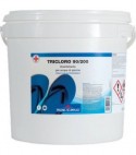In pastiglie. A base di acido tricloroisocianurico, comunemente chiamato tricloro, usato per la clorazione di mantenimento giornaliero. Da inserire negli appositi skimmer, nei dosatori galleggianti o nei dissolutori a pastiglie. A lenta dissoluzione. Utilizzo: 2 o 3 pastiglie ogni Mc. 50 di acqua.
