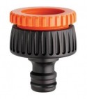 Filettatura femmina avvitabile al rubinetto con riduzione. Superficie prensile. Innesto rapido al portagomma.