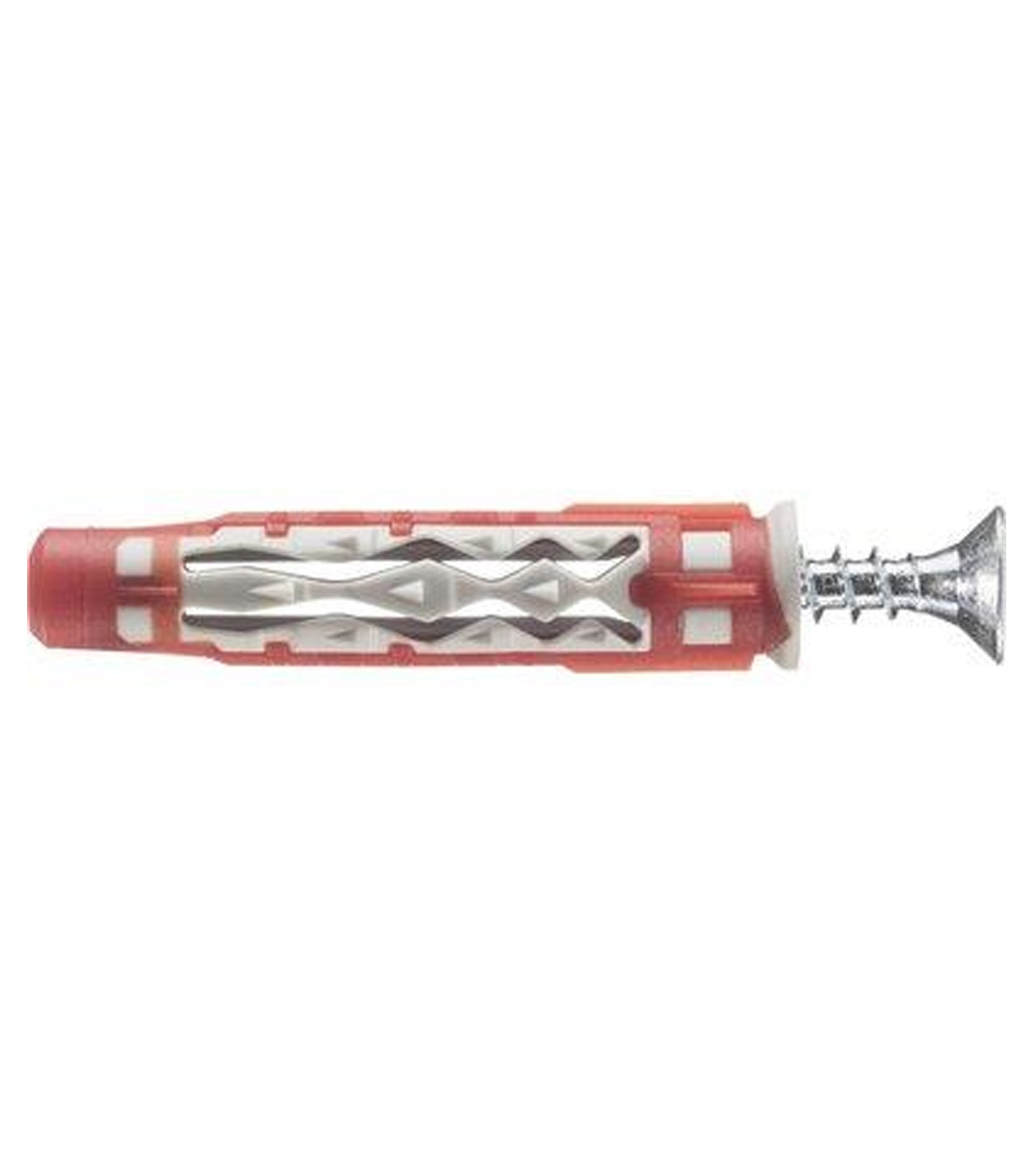 Con speciale struttura bi-materia, poliammide rinforzato su tutta la lunghezza e sul cono di punta Espande su 4 direzioni o annoda automaticamente, in base alle diverse strutture dei supporti. Collarino flessibile che si adatta al meglio nei fissaggi a filo parete, o si comprime agevolmente nei fissaggi passanti attraverso loggetto da fissare. 4 alette anti rotazione in fase di avvitamento. Controllo totale nella posa grazie ai due anelli rinforzati che controllano la flessione e lannodamento. Completo di vite a testa piana svasata.