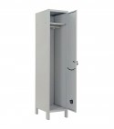 In lamiera di acciaio pressopiegata, con pretrattamento di fosfosgrassaggio e verniciatura a forno continuo. Colore grigio RAL 7035. Allestito con porta asciugamani, appendiabiti, ripiano interno, feritoie e porta ombrelli. Con serratura a cilindro. Da assemblare.
