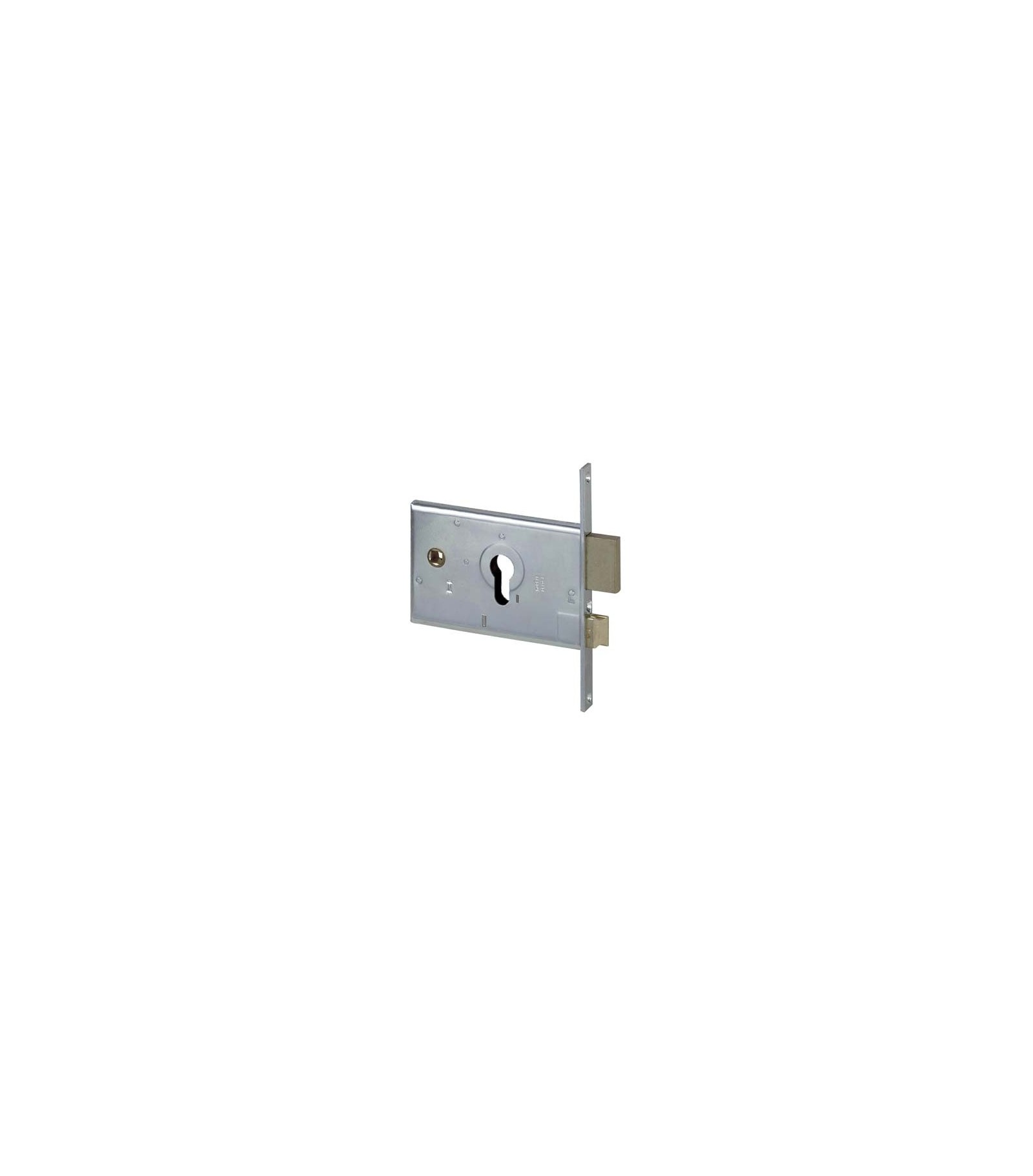 Per cilindro sagomato. Scrocco reversibile. Chiusura con catenaccio reversibile a 2 mandate. Quadro maniglia Mm. 8. Frontale in acciaio zincato con bordo quadro da Mm. 16x160. Altezza scatola Mm. 82. In dotazione: viti di fissaggio per cilindro.