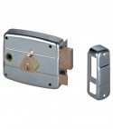 Con cilindro interno ed esterno fissi. Scrocco. Chiusura con catenaccio a 2 mandate. Tirante. Quadro maniglia passante Mm. 8. In acciaio zincato. In dotazione: 1 bocchetta, 3 chiavi piatte e viti di fissaggio.